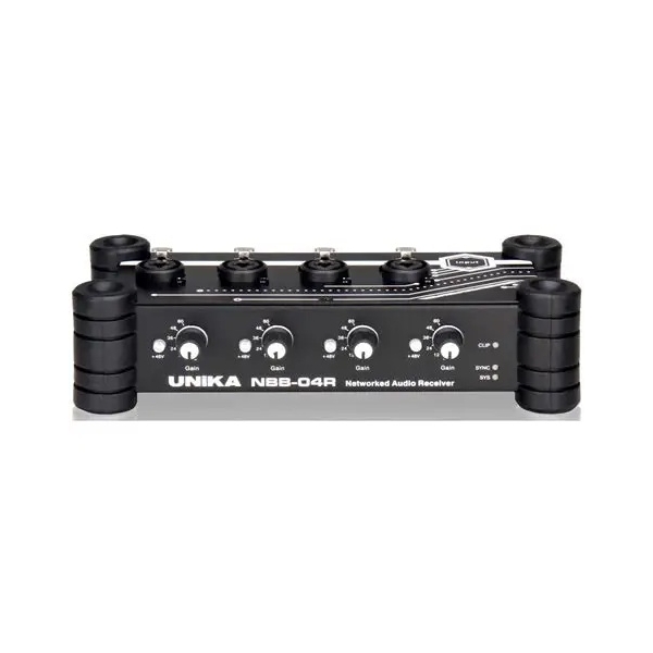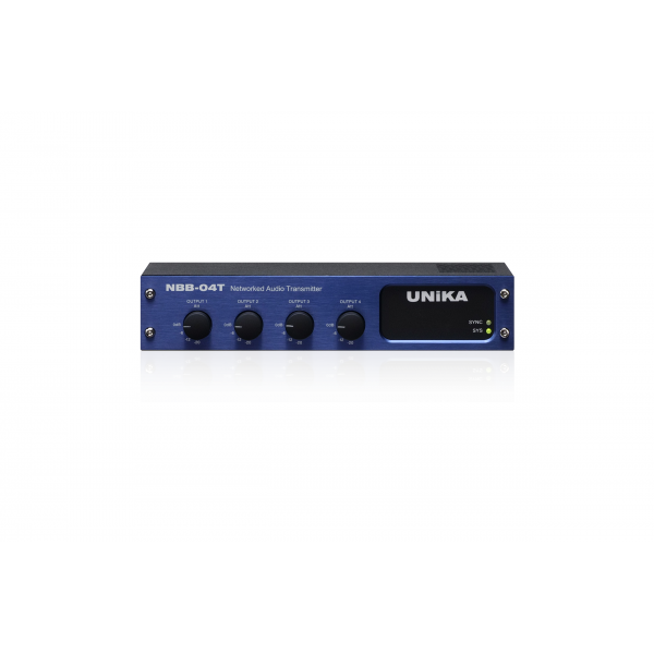 The UNINBB04T-V2 is a high-quality Dante audio transmitter designed for networked sound distribution in live, install, and broadcast environments. Measuring 44 x 220 x 130 mm, it features a metal chassis with an aluminum front panel, dual Gigabit RJ45 ports for daisy-chain networking, and PoE or 48VDC power to ensure reliable low-latency performance.