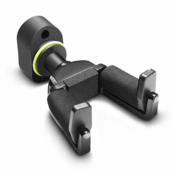 Built from die-cast aluminium and plastic with a black powder-coated finish, the yoke is covered with a specially formulated rubber coating intended to reduce finish marking. Designed for holding one guitar, it includes an interchangeable colour coding ring and a black ring pack, and weighs 0.25 kg.