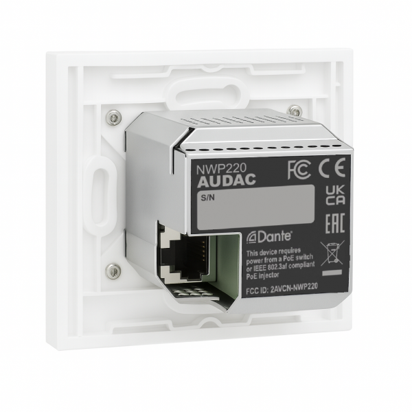 The AUDAC NWP220PLUS/W is a sleek, PoE-powered Dante™/AES67 networked audio input panel featuring two XLR inputs and an integrated Bluetooth 4.2 receiver. Designed for seamless integration into modern AV systems, it allows for flexible audio input options, supporting both line-level and microphone-level signals with switchable +48V phantom power. The panel includes internal DSP processing with EQ, automatic gain control, and other configurable settings via the AUDAC Touch™ software. Its elegant design features a fingerprint-resistant glass front panel, and it's compatible with standard EU-style in-wall boxes. The package includes the WB45S/FG flush-mount wallbox, making it ideal for installations in corporate, educational, hospitality, and government environments.