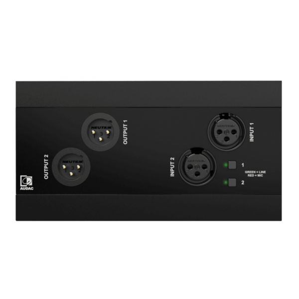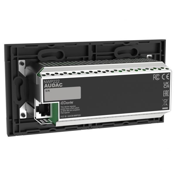 The NWP222 is a versatile Dante™/AES67 network input panel featuring two XLR input and output connectors and an integrated Bluetooth receiver, allowing for seamless audio transmission and reception within a Dante™ audio network. The audio inputs can switch between line-level and microphone-level signals, with +48 V DC phantom power available for condenser microphones. Additional features such as integrated equalization, automatic level control, and other settings can be configured through the AUDAC Touch™ app.