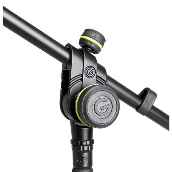 The GMS2322B is a microphone stand with thick-walled steel tubing and a black powder-coated finish. It adjusts from 1000 mm to 1680 mm and includes a telescoping boom arm with precision 2-point tilt and position adjustment for controlled microphone placement.
