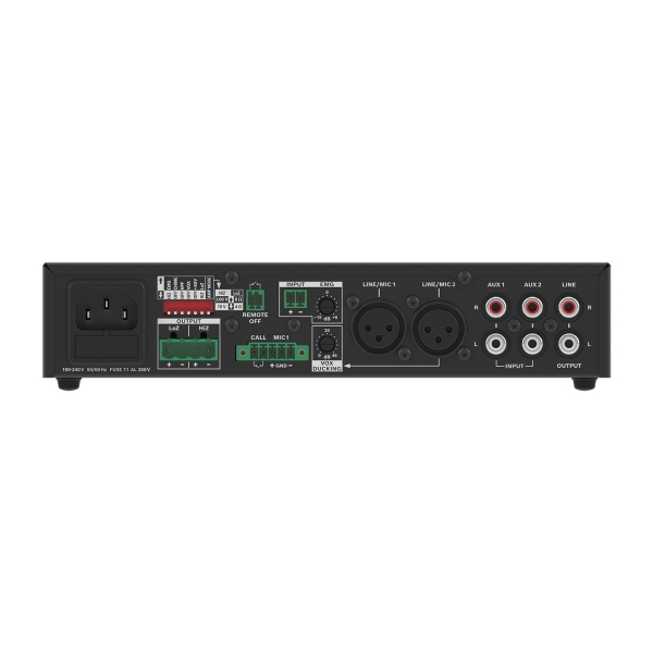 The DYNU120-1M is a high-quality mixer amplifier designed for background music paging and voice evacuation in small to medium commercial installations. Measuring 44.2 x 218 x 217.7 mm half rack 1U, it features a robust Class I grounded metal chassis with class D amplification and four stage fan cooling to ensure efficient reliable continuous-duty performance.