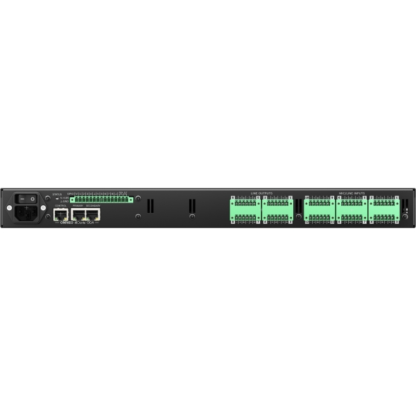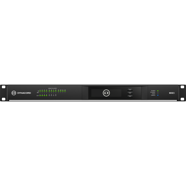 The MXE5-64 is a high-quality open-architecture DSP matrix mix engine designed for professional installed sound, networked audio routing, and venue-wide system control. Measuring 483 x 43.5 x 471 mm in a 19-inch 1RU rackmount chassis, it features 76x72 channel matrix capability with 12 mic-line inputs, 8 line outputs, and 64x64 Dante (AES67 compatible) networking to ensure pristine audio quality and ultra-low latency performance.