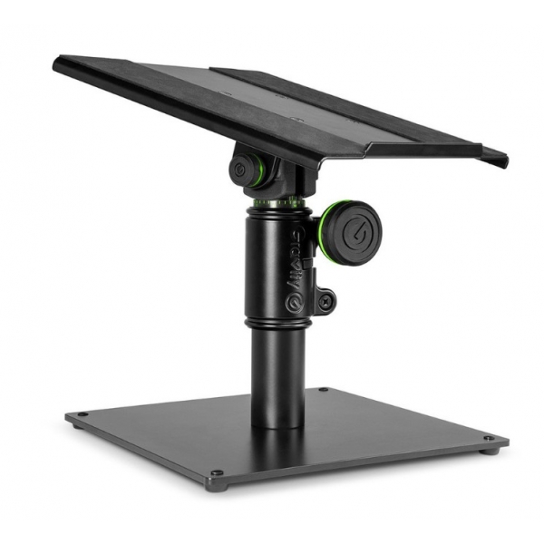 The GSP3102 is a desk-clamp speaker stand for positioning studio monitors on workstations where floor stands are impractical. Measuring 263-358 mm in height with a 240 x 250 mm EVA-padded bearing surface, it uses powder-coated steel tubing and a steel base with a 250 mm edge length for stable placement and controlled vibration contact.